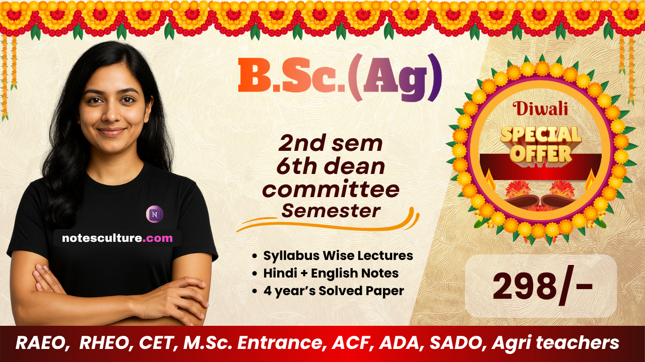 Dear students - आपका स्वागत है 🙏 \nINDIAके सबसे बड़े एग्रीकल्चर E-learning App पर \n\nइस कोर्स में आप को पढ़ाएंगे 10 से भी ज्यादा JRF, SRF & NET Qualified Ph.D Faculties. \n\nइस कोर्स में आपको मिलेंगे \n1. Chapter-wise video lecture \n2. Best notes (Designed)\n3. Doubt section \n4. previous years all paper. तो अब देर न करते हुए अभी कोर्स खरीदे और बिना रुकावट जुड़ जाइए अपने लक्ष्य को पाने के लिए \n"क्योंकि बहुत हुए कोचिंग के चक्कर. बस फोन उठाओ और यूज़ करो Notesculture" \n\nछत्तीसगढ़ का एकमात्र Digital Agriculture Coaching Institute जिसमें सबसे ज्यादा है छात्रों को भरोसा \nNotesculture\nMo. 7000606314, 9174222666